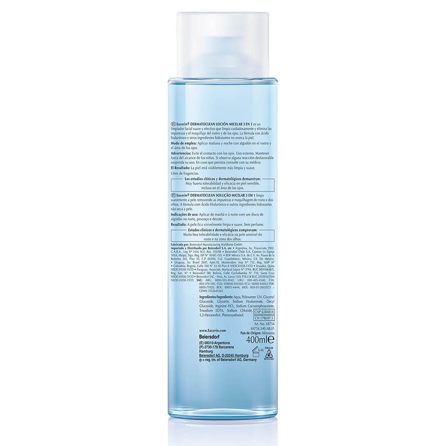 La Loción micelar 3 en 1 Eucerin DermatoCLEAN es una solución de limpieza refrescante que elimina el maquillaje soluble en agua de los ojos y del rostro. Contiene una combinación innovadora de tres ingredientes activos: Complejo limpiador APG, Gluco-Glicerol y Ácido Hialurónico, que ayudan a que la piel respire mejor, dejándola más limpia, aliviada, visiblemente más suave, elástica y mejor preparada para la regeneración. El uso de la loción no reseca la piel y aumenta significativamente la hidratación después de una semana de uso regular. Está probado en piel sensible y ojos. También demostró ser segura para usuarios de lentes de contacto.