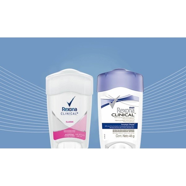 Rexona Desodorante Antitranspirante Masculino Crema Clinical 48gr. 3 veces más protección que un antitranspirante común contra la transpiración excesiva. Tecnología TRIsolid: Máxima protección de Rexona. Ingrediente humectante para el cuidado de la piel y niveles de protección científicamente probados. Nada es más fuerte. La transpiración y el mal olor pueden ser una gran preocupación para muchas personas. Rexona Clinical te brinda 3 veces más protección que un antitranspirante común.